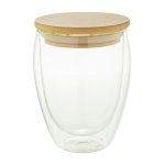 Kubek termiczny ze szkła borokrzemowego o podwójnych ściankach z bambusową pokrywką, pojemność 320 ml. W pudełku z papieru kraft. Bamusowa pokrywka zapewnia ciepło pnapokju przez dłuższy czas.