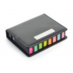 Zestaw karteczek samoprzylepnych w etui wykonanym z ekoskóry. Do etui dołączono wyciąganą kartkę na notatki. Zestaw zawiera dwa średnie bloczki oraz 8 małych bloczków w różnych kolorach.