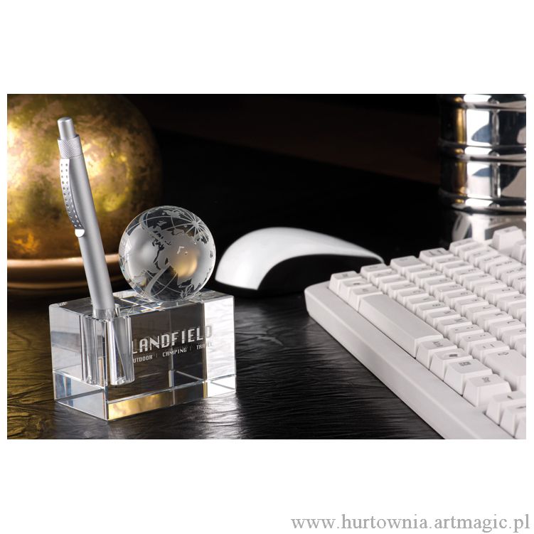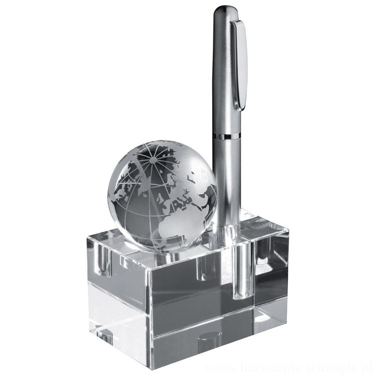 Szklany blok z globusem i z miejscem na długopis.
