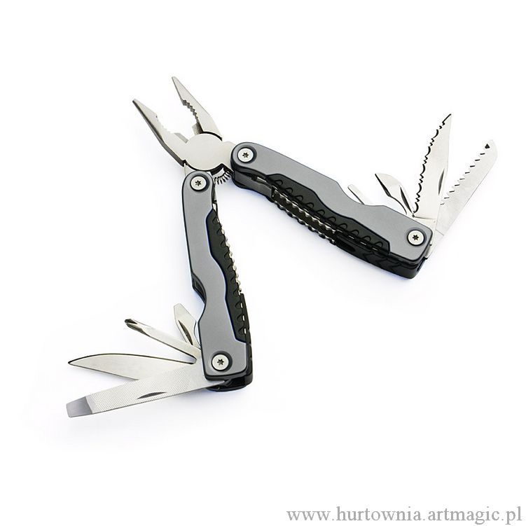 Metalowe narzędzie wielofunkcyjne zawierające w swoim składzie wszystkie potrzebne rzeczy do przeprowadzenia podstawowych prac.