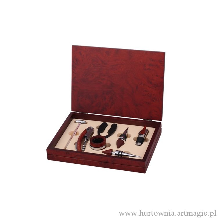 Zestaw do wina składający się z termometru, korkociągu, okapnika, obcinaka do folii, 3 zatyczek do butelek. Pakowany w białe kartonowe opakowanie.