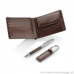 Komplet upominkowy zawierający portfel, brelok oraz metalowy długopis. Portfel wykonany z ekoskóry zawiera 2 przegródki na banknoty, kieszeń na bilon oraz dodatkowe kieszenie na karty kredytowe czy paragony. Całość zapakowana w eleganckie czarne pudełko. Grawerujemy na każdym elemencie lub na pudełku.