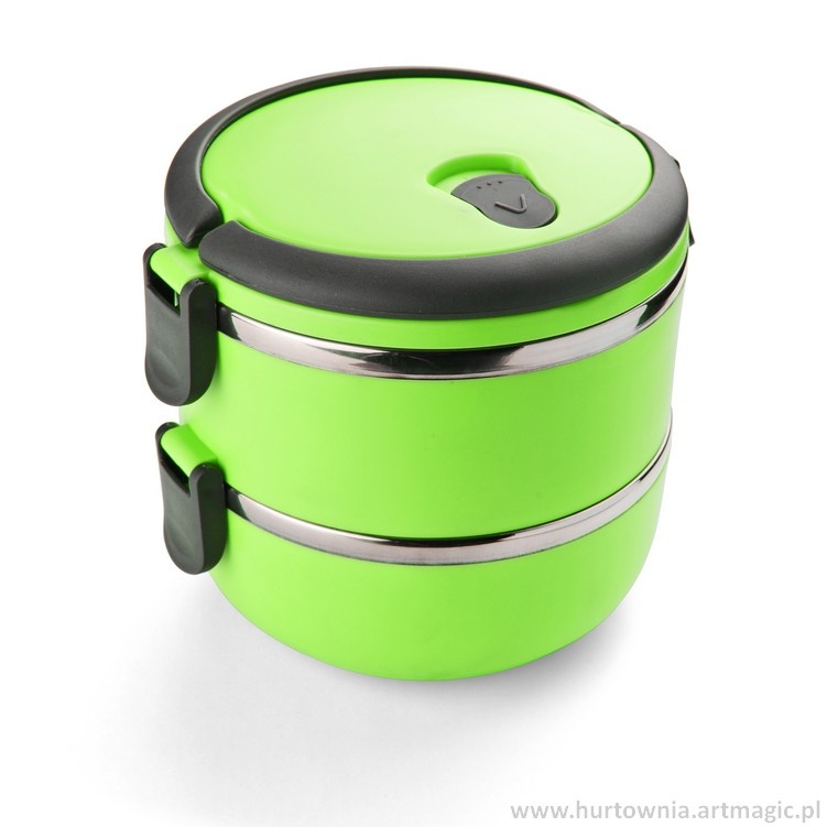 Pojemnik z wnętrzem ze stali nierdzewnej podzielony na dwie komory, które składamy jedną na drugą, co zapewnia poręczne i wygodne przenoszenie dwudaniowych posiłków. Górna komora wyposażona w uszczelkę. Uchwyty z tworzywa sztucznego z możliwością złożenia. Łączna pojemność: 1400 ml.