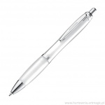 Plastikowy długopis transparentny z dużym, niebieskim wkładem. Produkt wyposażony w srebrny, metalowy klip oraz gumkę ułatwiającą trzymanie. Państwa logotyp nadrukujemy na korpusie długopisu z prawej strony klipu.