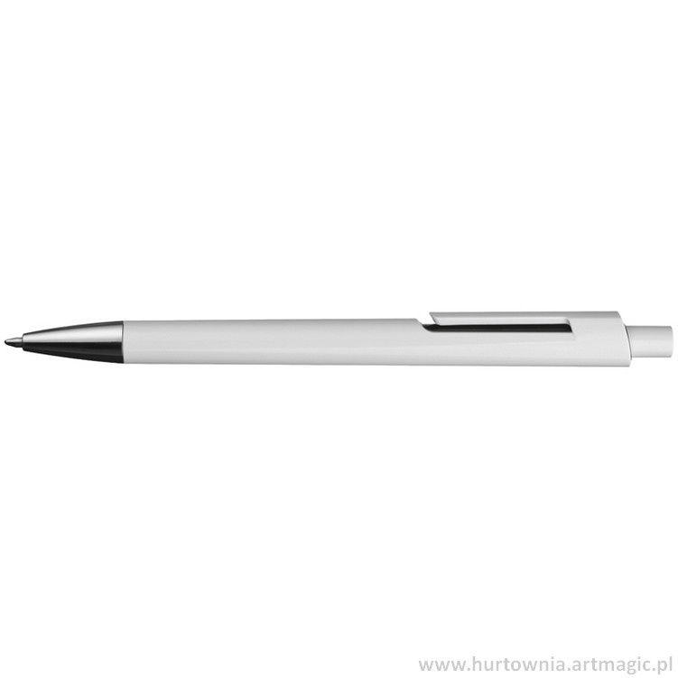 Plastikowy długopis z wkładem piszącym na niebiesko. Długopis posiada białą obudowę i kolorową aplikację pod klipem.