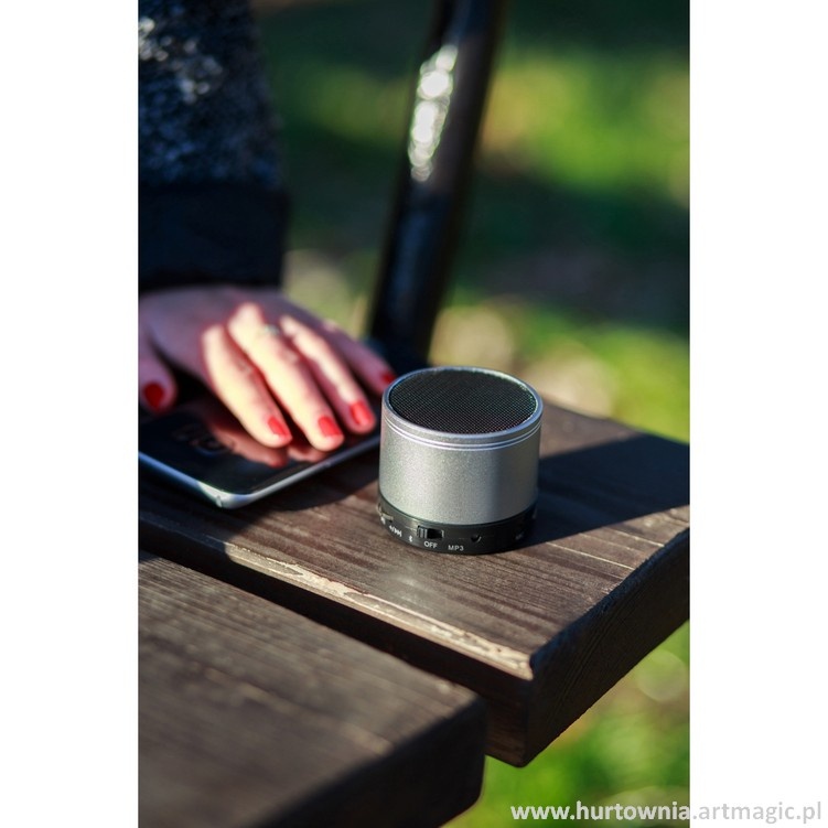 Głośnik 3W wyposażony w Bluetooth 2.1 z funkcją przyspieszającą szybkość transmisji EDR. Wyposażony w port na kartę micro SD, kabel do ładowania, radio. Dodatkowo funkcja odbierania połączeń z telefonu. Zasięg 10 m, pojemność baterii 300 mAh, ładowanie ok. 2 godz., odtwarzanie ok. 4-5 godz.
