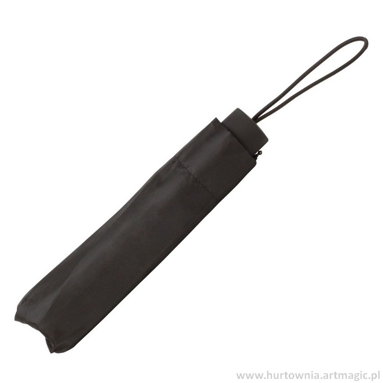 Składany parasol ręcznie otwierany i zamykany. Rama i żebra wykonane z włókna szklanego i aluminium, pałąk z metalu. Plastikowa, gumowana rączka typu soft grip wyposażona w opaskę z taśmy elastycznej. Pakowany w etui poliestrowe.