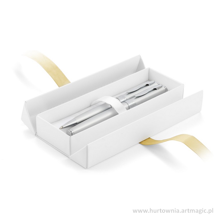 Etui do pakowania artykułów piśmienniczych wykonane z papieru. Zamykane za pomocą wstążki, którą można zawiązać w ozdobną kokardę.