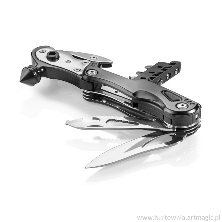 ESCAPE to niezbędne wyposażenie każdego samochodu, które warto mieć zawsze pod ręką. Zawiera aż 11 funkcji w jednym narzędziu z czego najważniejszymi są zbijak do szyb oraz przecinak do pasów bezpieczeństwa. Dodatkowo posiada takie funkcje jak: latarka, nóż, komplet 3 bitów, dwukierunkowy uchwyt na bity, uniwersalny klucz sześciokątny, płaski śrubokręt, piłę oraz otwieracz do butelek i puszek. W komplecie znajduje się również czarny, materiałowy pokrowiec na narzędzie.