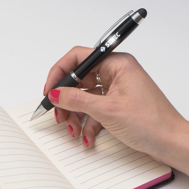 Wyjątkowy długopis w kolorze czarnym wyposażony w touch pen. Dodatkowym autem będzie wbudowana lampka, podświetlająca znakowanie. Po jego włączeniu zostanie podświetlony. Długopis plastikowy z antypoślizgową gumką i metalowym klipem. Do wyboru jest kilka kolorów podświetlenia (wybierz atrybut) . Kolor podświetlenia to także kolor gumki. Grawer laserowy wykonamy w cenie produktu w 1 miejscu. Długopis zawiera baterie.