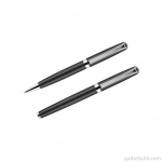 GEORGIA to elegancki zestaw piśmienniczy składający się z długopisu oraz pióra wiecznego. Przybory piśmiennicze wykonane z metalu zapakowane są w etui z czarnej ekoskóry. Długopis z mechanizmem typu twist. Do pióra wiecznego dołączony jest jeden nabój z atramentem. Wkład długopisu oraz atrament naboju do pióra w kolorze czarnym.