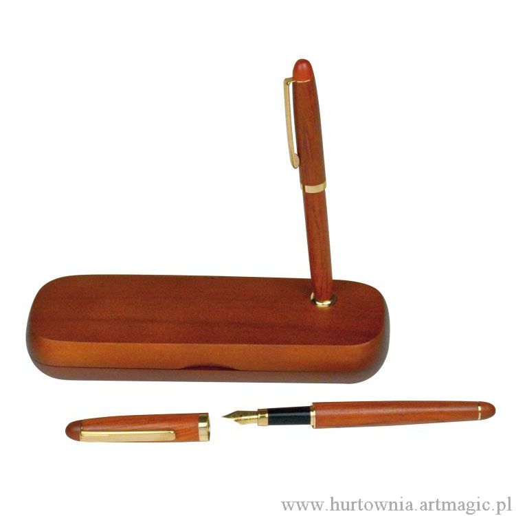 Drewniany długopis z obrotowym mechanizmem i niebieskim, metalowym wkładem oraz drewniane pióro wieczne, zawierające niebieski nabój. Etui po zamknięciu może służyć jako podstawka. Te wszystkie elementy sprawiają, że zestaw ten pasuje do każdego biurka. Długopis i pióro wyposażone są w pozłacane, metalowe aplikacje, co nadaje im luksusowy wygląd. Polecamy złoty nadruk na drewnianym pudełku, w dolnym prawym rogu zewnętrznej strony etui. Pakowany w pojedynczy kartonik.