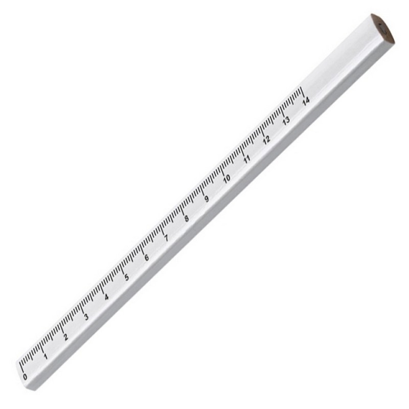 Ołówek stolarski z nadrukowaną skalą pomiarową po jednej stronie. Ołówek nie jest zatemperowany.