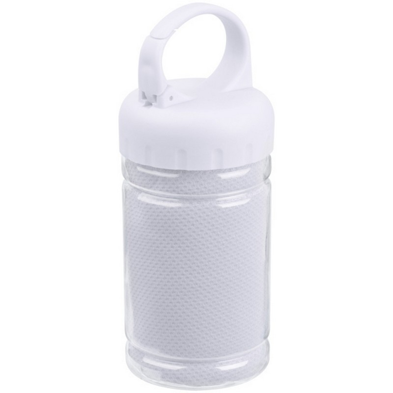 Ręcznik sportowy (79 x 29 cm) z szybkoschnącego materiału, umieszczony w plastikowej butelce. Zakrętka butelki ma otwierany uchwyt umożliwiający przypięcie butelki np. do paska od spodni.
