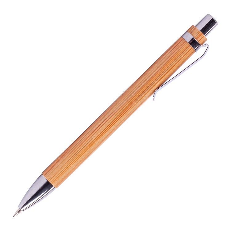 Bambusowy zestaw piśmienniczy w pudełku, składający się z długopisu z końcówką do ekranów dotykowych oraz ołówka automatycznego. Bambus jest biodegradowalny a metal nadaje się do recyklingu.