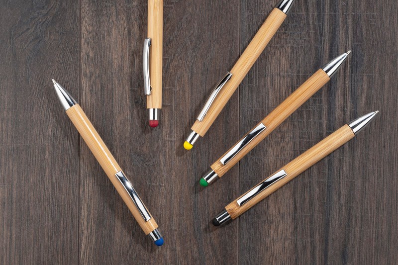 TUSO to długopis, którego korpus został w całości wykonany z bambusa. Chromowane wykończenia nadają mu elegancji. Kolorowa końcówka do obsługi ekranów dotykowych stanowi ciekawą ozdobę. Długopis automatyczny. Wkład typu G2 w kolorze niebieskim.