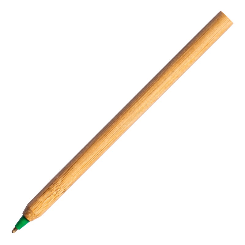 Bambusowy długopis z kolorową końcówką. Długopis nie posiada zatyczki. Końcówka wkładu zabezpieczona za pomocą wosku.
