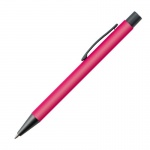 Plastikowy długopis z niebieskim wkładem, kolorową obudową i metalowym klipsem.