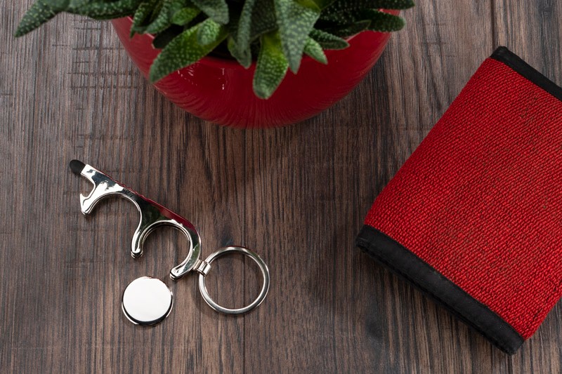 Brelok anti – touch TUS to uniwersalny dodatek do kluczy. Z jego pomocą nie trzeba dotykać bezpośrednio klamek czy przycisków np. w bankomacie. Brelok zawiera monetę do wózków sklepowych oraz pełni funkcję otwieracza do butelek. Na zakończeniu zamocowana jest gumka, dzięki której możemy zastosować go przy ekranach dotykowych. To przydatny gadżet, zwłaszcza w czasie epidemii. Brelok pakowany jest w brązową, papierową kopertę.