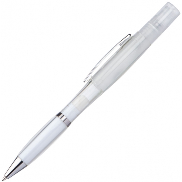 Półprzezroczysty długopis z mechanizmem obrotowym ze srebrnymi wykończeniami i niebieskim wkładem. Spryskiwacz jest wielokrotnego użytku - idealny do perfum lub płynów dezynfekujących (sprzedawany bez zwartości).