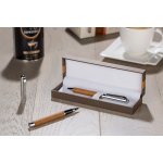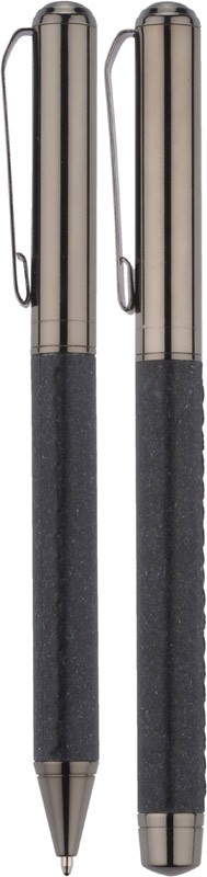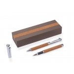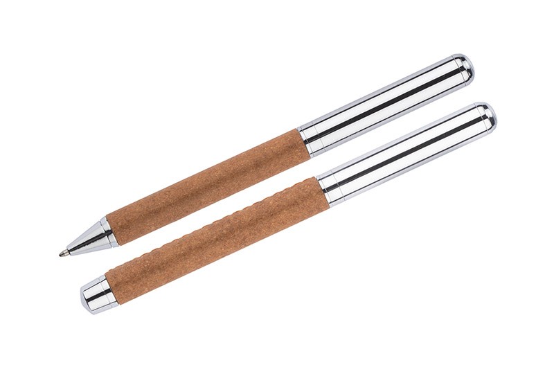 Zestaw OHIO to propozycja eleganckiego kompletu piśmienniczego nawiązującego do eko trendów. Metalowy korpus długopisów został wykończony naturalną skórą z recyklingu. Chromowane wykończenia świetnie komponują się z naturalnym surowcem na korpusie. W zestawie długopis oraz pióro kulkowe. Wkłady w kolorze niebieskim. Zestaw zapakowany w gustowne pudełko wykonane z papieru. Wieczko ozdobione skórą z recyklingu.