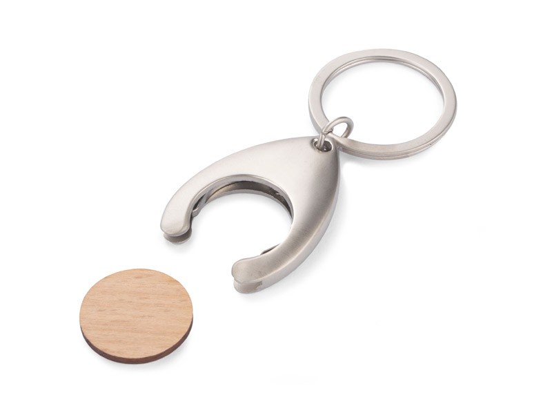 Brelok metalowy wraz z żetonem wykonanym z drewna mebli po recyklingu. Żeton pasuje do wózków sklepowych. Zapakowany w brązową kopertę.