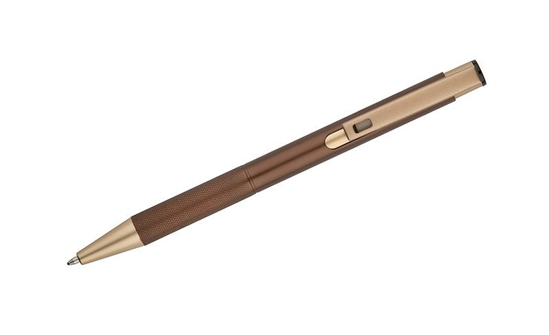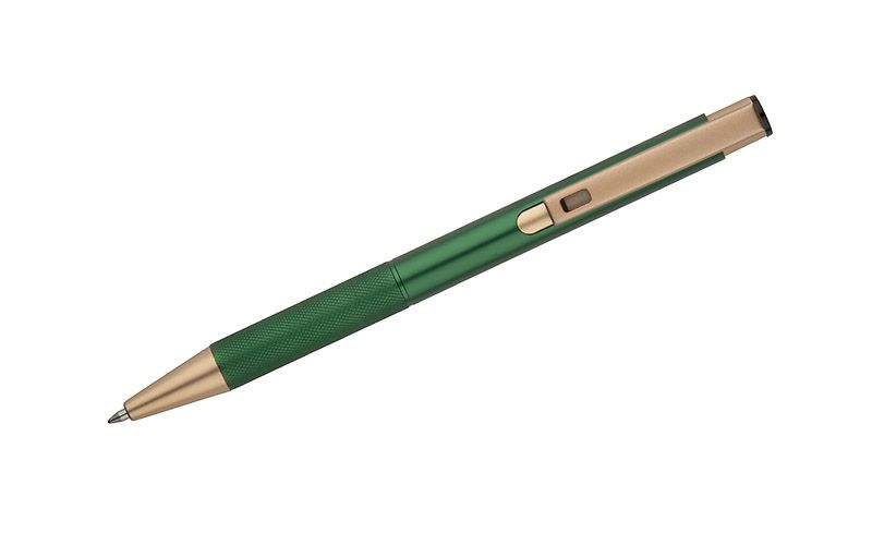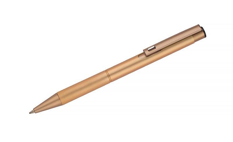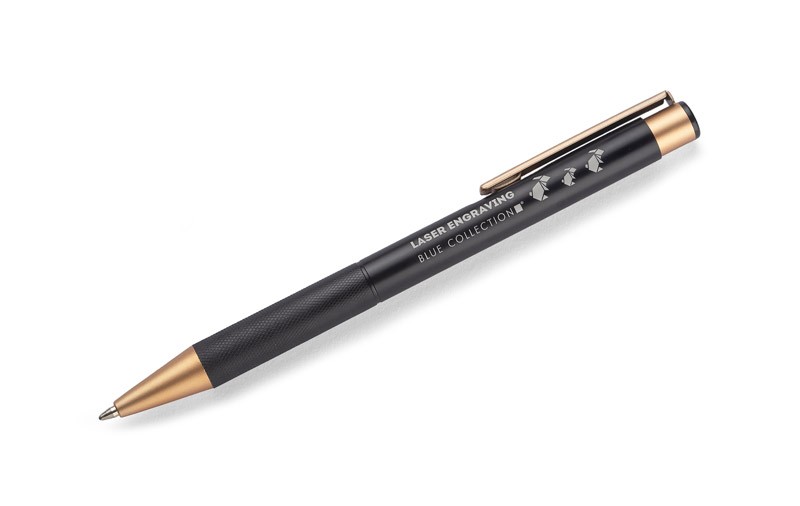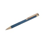 Elegancki aluminiowy długopis. Wykończenia w kolorze złotym. Wkład półżelowy w kolorze niebieskim.