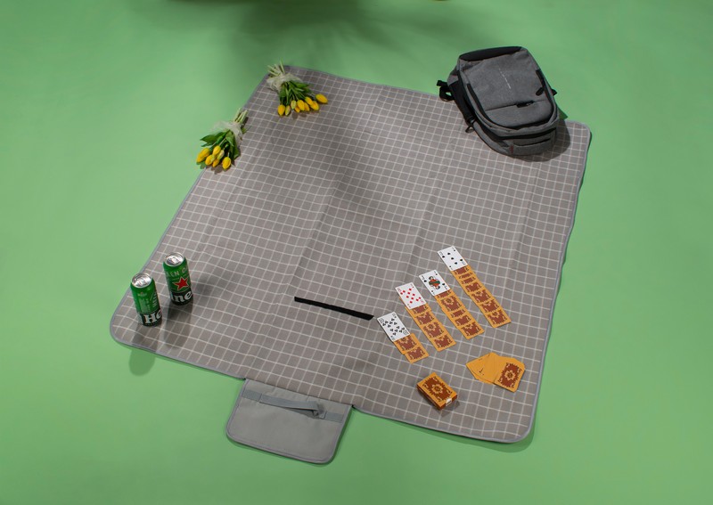 Koc piknikowy wykonany z gładkiego polaru w klasyczny wzór w kratę. Od spodu posiada wodoodporną warstwę PET. Po złożeniu klapa zapinana na rzep.