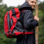 Plecak turystyczno-trekkingowy. Składający się z komory głównej z osobną kieszenią na laptop 15" zapinaną na rzep. Dodatkowo plecak posiada dużą kieszeń przednią i jedną mniejszą, obie zapinane na zamek. Dwie boczne kieszonki z siateczki. Po bokach dodatkowo znajdują się panele z regulowanymi paskami i klamrami. Wygodne plecy i szelki wykonane są z miękkiej pianki z wentylacją typu mesh. Stabilne noszenie plecaka gwarantuje poziomy, regulowany pasek piersiowy z klamrą oraz miękki pas biodrowy. Podszewka z poliestru 210T. Szwy wewnętrzne wzmocnione poliestrową taśmą. Pojemność 33 L.