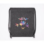 Worek DENGY wykonany z recyklingowanego filcu rPET w grafitowym, neutralnym kolorze. W połączeniu z czarnymi sznureczkami i uchwytem prezentuje się niezwykle ciekawie.