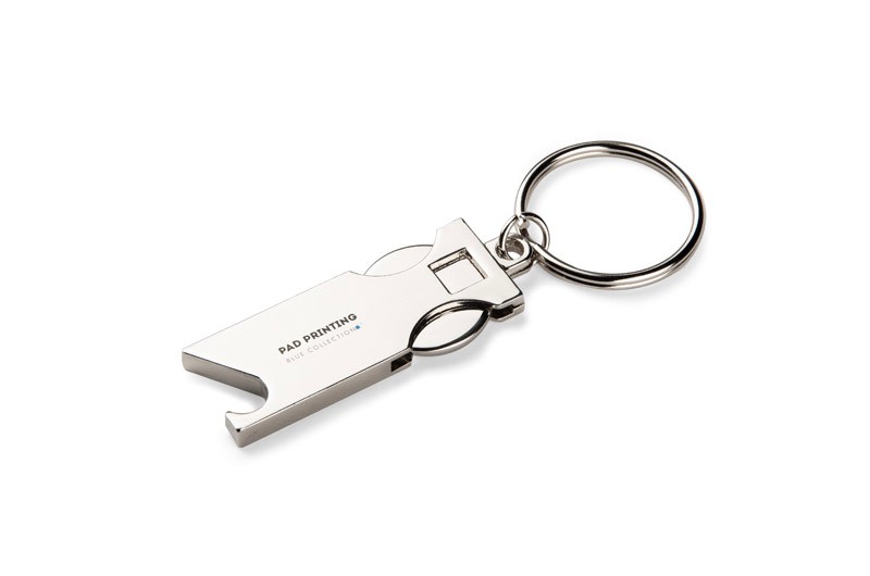 Metalowy brelok SPRITI to elegancki i trwały gadżet reklamowy, łączący funkcję otwieracza do butelek i żetonu do wózka sklepowego. Pakowany w brązową kopertę.
