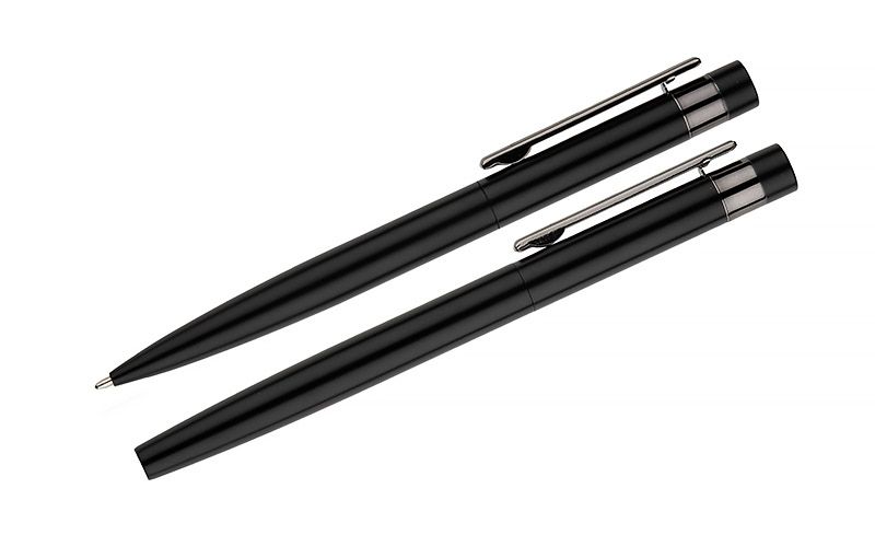Zestaw piśmienniczy ZILE w etui zawiera metalowy długopis i pióro kulkowe o nowoczesnym wykończeniu. Całość uzupełnia elegancki, ciemnoszary klips, który nadaje zestawowi profesjonalny charakter. Doskonały wybór na biznesowy upominek.