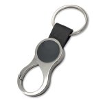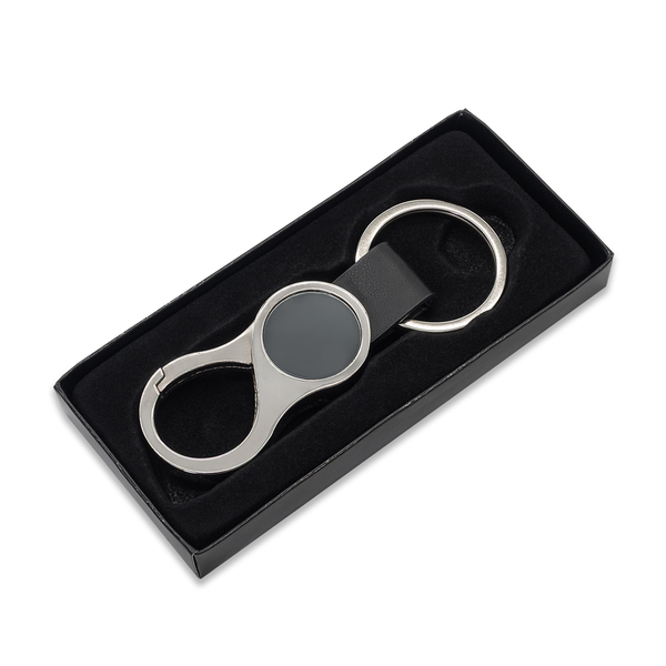 Brelok będący eleganckim połączeniem metalu i ekoskóry. Pakowany w czarne kartonowe opakowanie upominkowe.