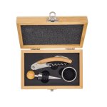 Elegancki zestaw akcesoriów do wina zawiera: korkociąg kelnerski z drewnianą rączką, wyposażony w otwieracz do butelek i nożyk do folii, zatyczkę do butelki oraz okapnik.