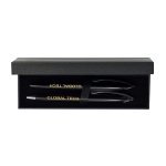 Elegancki zestaw składający się z metalowego długopisu i pióra kulkowego. Wkłady w kolorze niebieskim. Obrotowy mechanizm włączania.