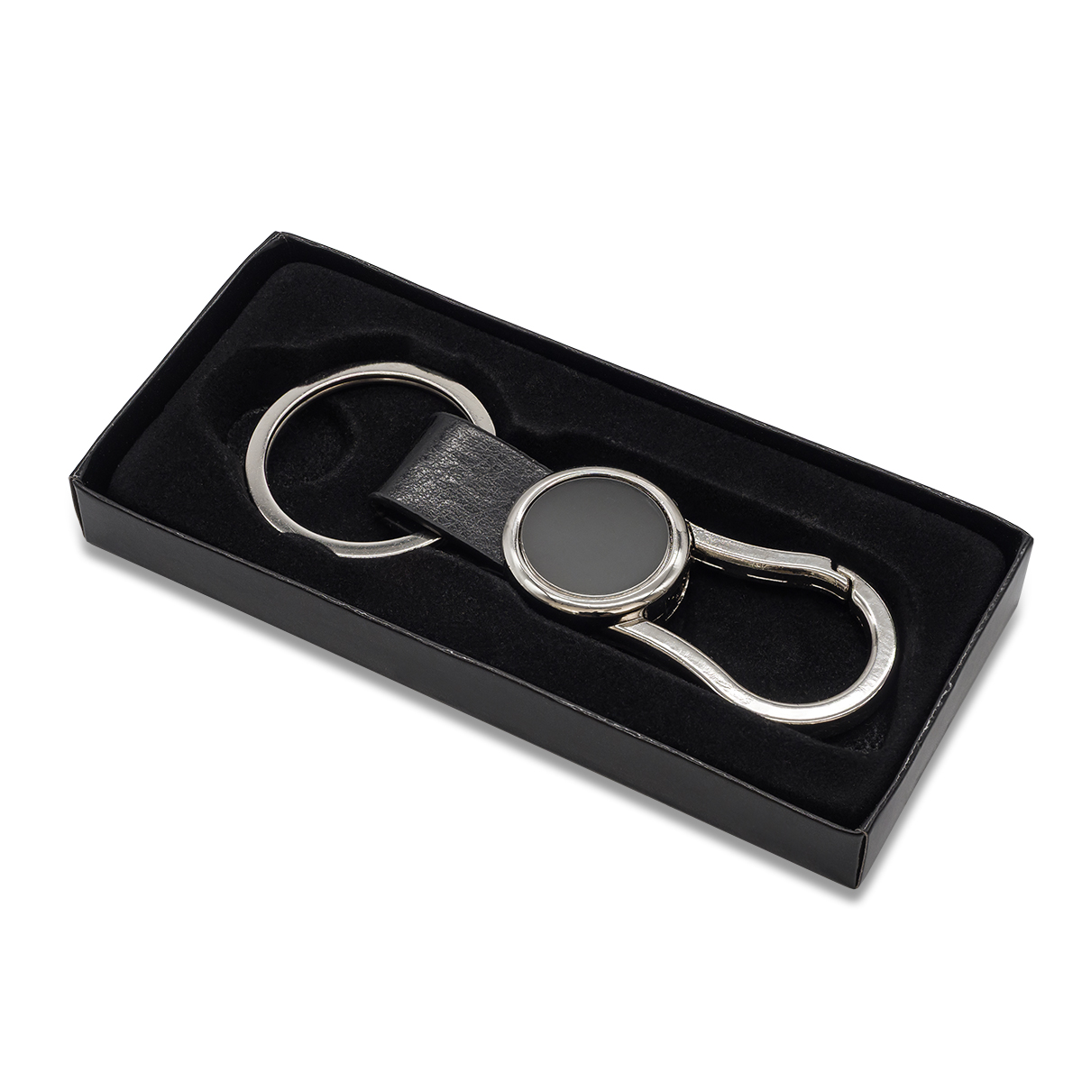 Brelok będący eleganckim połączeniem metalu i ekoskóry. Pakowany w czarne kartonowe opakowanie upominkowe.